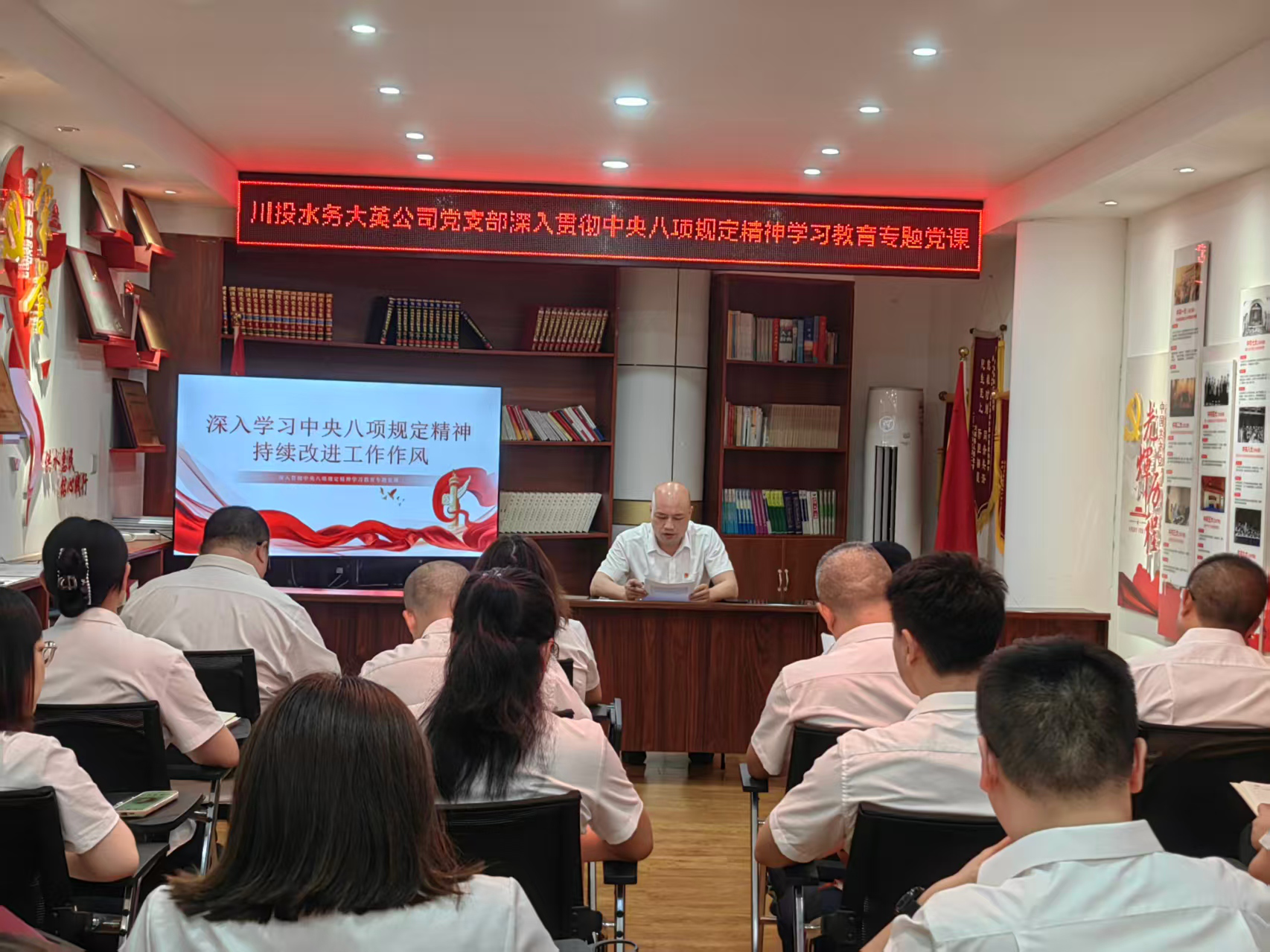 為深入貫徹落實(shí)中央八項(xiàng)規(guī)定精神,持續(xù)改進(jìn)工作作風(fēng)建設(shè),川投水務(wù)大英公司黨支部于6月19日在公司黨員活動室開展了“深入貫徹中央八項(xiàng)規(guī)定精神學(xué)習(xí)教育”專題黨課,全體黨員參加了此次學(xué)習(xí)。