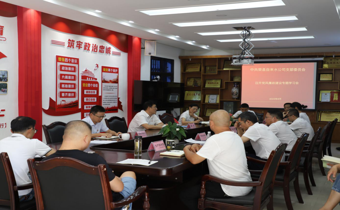 8月25日,為深入推進全面從嚴治黨治企,增強廣大黨員干部防腐拒變能力,榮縣水司黨支部組織召開黨風廉政建設專題學習會,黨支部書記、執(zhí)行董事、總經(jīng)理龔慶主持會議,領導班子成員、中層副職以上及黨員代表參加會議。