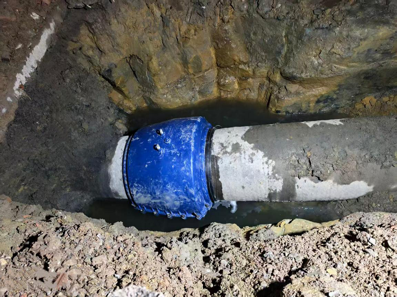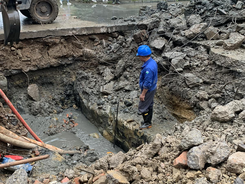 下午2時,公司準時關閉總閘,2臺挖掘機同步開展深度挖掘作業(yè)。受管道埋深大、地下土質復雜、作業(yè)面狹窄等因素影響,施工難度遠超預期。經(jīng)過8小時連續(xù)作業(yè),施工人員才找到DN800mm預應力水泥管,并確認爆管主要因為管道大小接頭處膠圈斷裂。
