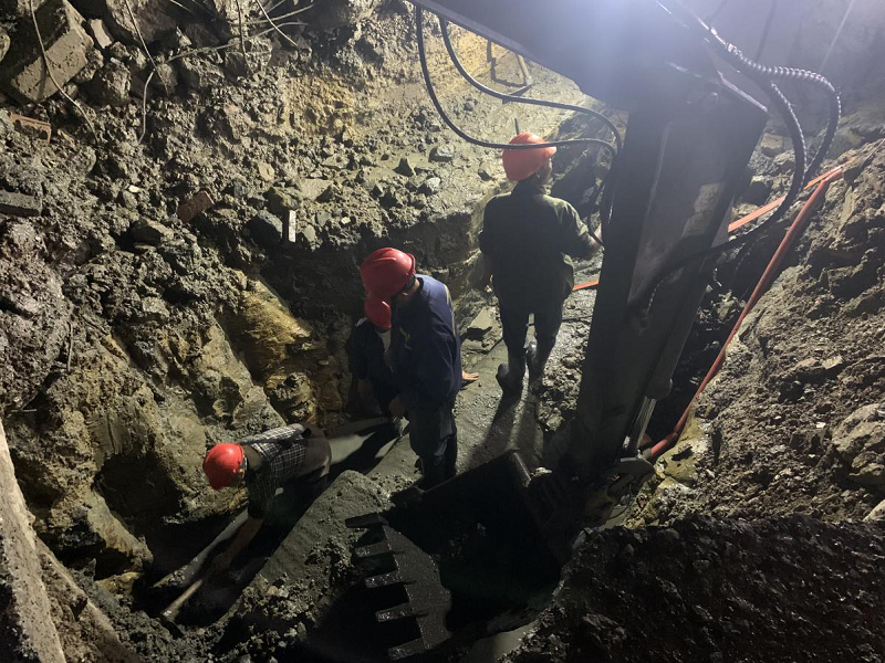 現(xiàn)場立即安排人員前往庫房調取專用搶修物資——8月定制的DN800球墨鑄鐵搶修節(jié)。又因取水主管底部及周邊被完整巖石包裹,機械開挖無法繼續(xù),作業(yè)方式緊急轉為人工開挖,6名作業(yè)人員在狹窄空間內(nèi)佝僂身體,持續(xù)挖掘直至晚上10時30分,終于開辟出合格作業(yè)面。隨后,施工人員用機械將搶修節(jié)運送至作業(yè)點,反復調整角度確保與管道精準匹配,最終在10月22日凌晨2時21分完成全部搶修作業(yè)。