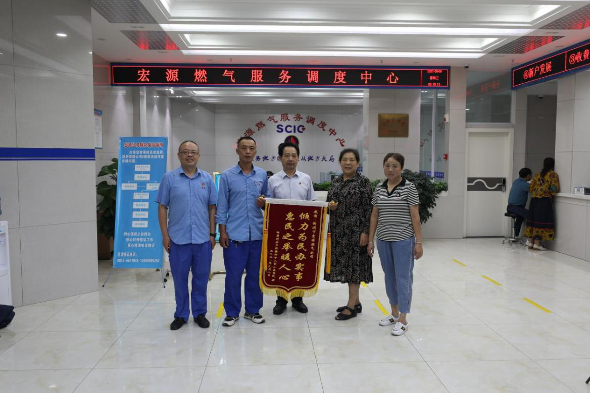 2021年9月8日上午8時,射洪市衙署街社區(qū)西橫街18號小區(qū)用戶代表將“傾力為民辦實事 惠民之舉暖人心”的錦旗送到宏源公司負責人的手中。